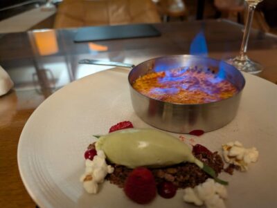 I had a Citrus Cured Salmon Starter, a Welsh venison main, and a huge creme brulee for dessert, all washed down with a gorgeous glass of Viognier.