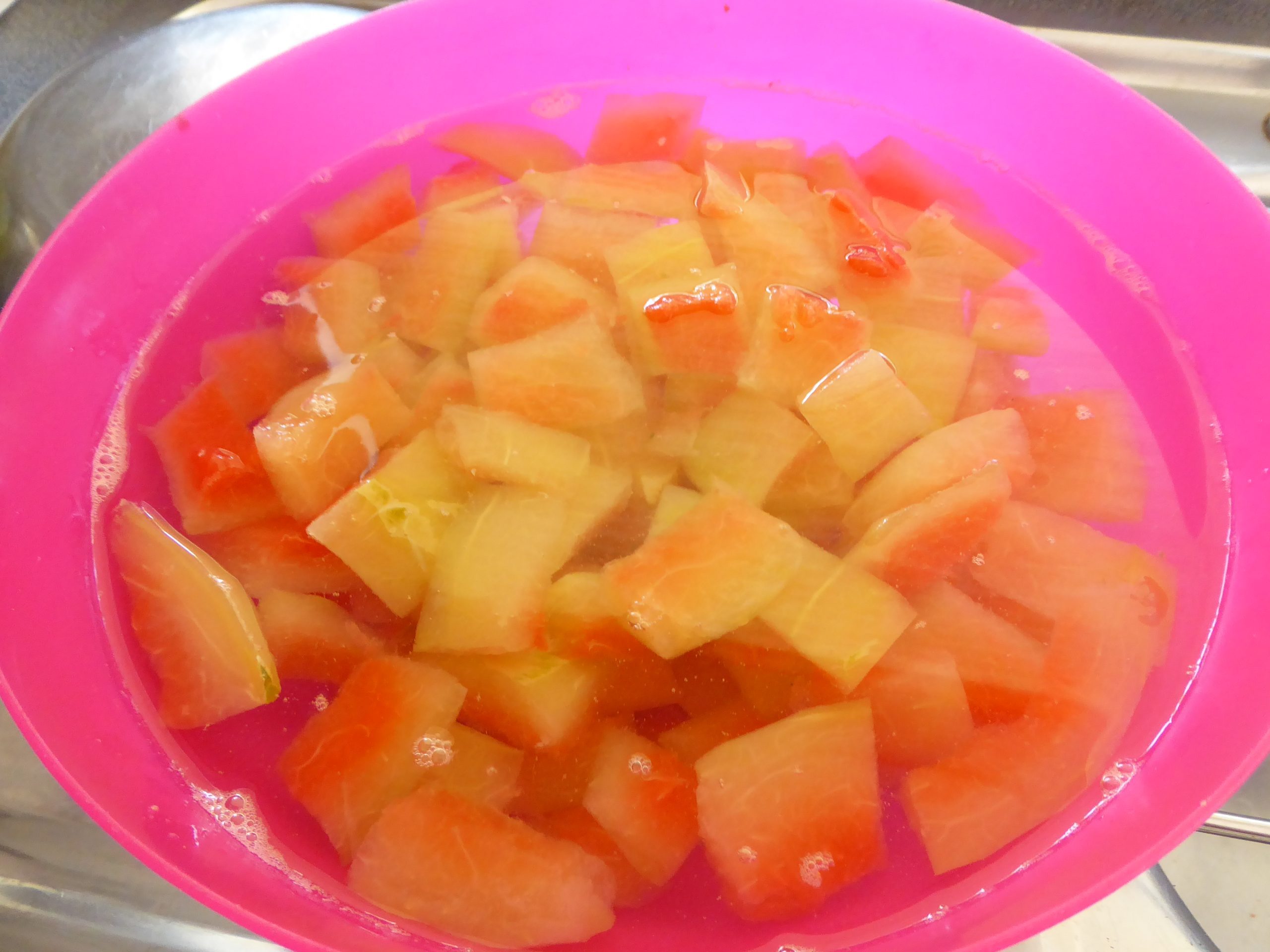 Place the cooked peel in a bowl. Cover with cold water and leave to soak for 24 hours.