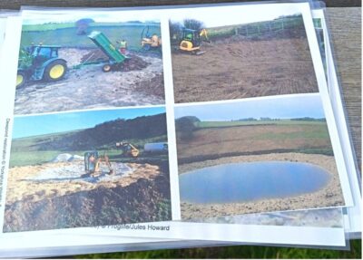 Becca from the SDNPA, armed with a tray and a net to allow us to see what thrives in these curious features, joined Will. The 280 hectares of the park contain many habitats — chalk downland, flood -plain meadows and wetlands. On the way to the first pond, Will gave us some background.  The ponds are not significantly filled by dew but by rainwater. They are also called ‘mist-ponds’  and ‘ship-ponds’ – deriving from sheep. Those on the South Downs were mainly created in the 18th and 19thcenturies by professional dew pond builders to provide water for the livestock. The usual method of construction involved a layer of straw, then compacted ‘puddle clay’ in the saucer-shaped excavations. The Enclosure Acts of the same period meant traditional watering points were no longer accessible as land ownership was concentrated into fewer hands. However, construction likely took place from prehistory to serve communities where there were no natural water sources.
