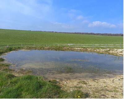 Along with eight others, I attended a walk to learn more about the dew ponds of the Country Park. These are not exclusive to Sussex,  also being found in Hampshire, Derbyshire, Staffordshire and Nottinghamshire. The walk was preceded by a talk given by David Riviere, who joined us. David has written a book – ‘Dew Ponds’ so is very knowledgeable. The walk aimed to visit three ponds within the Cuckmere Valley and was led by Will Johanson, who works as Ponds and Engagement Ranger for South Downs National Park Authority (SDNPA). His role is to create and restore ponds in the Central and Western Downs with funding from The ‘Downs to the Sea Project’ provided by the National Lottery  Heritage Fund.