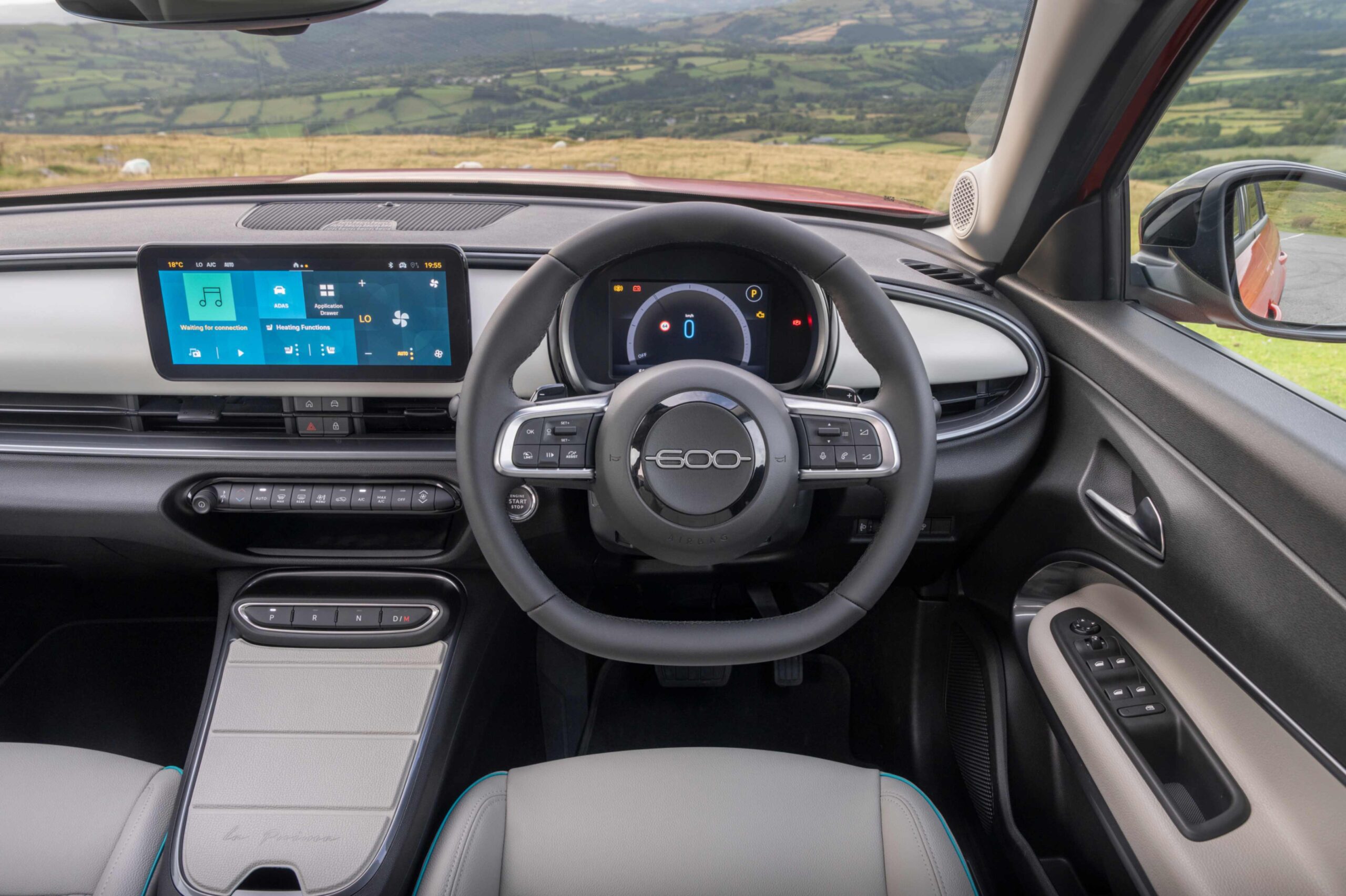The electric version of Fiat’s new 600 wades into battle with a 50.8kWh (usable capacity) battery and a 154bhp electric motor. This instantly makes it a little more powerful than the hybrid version, but it’s obviously a much nicer experience all round, having shed the gruff engine note.