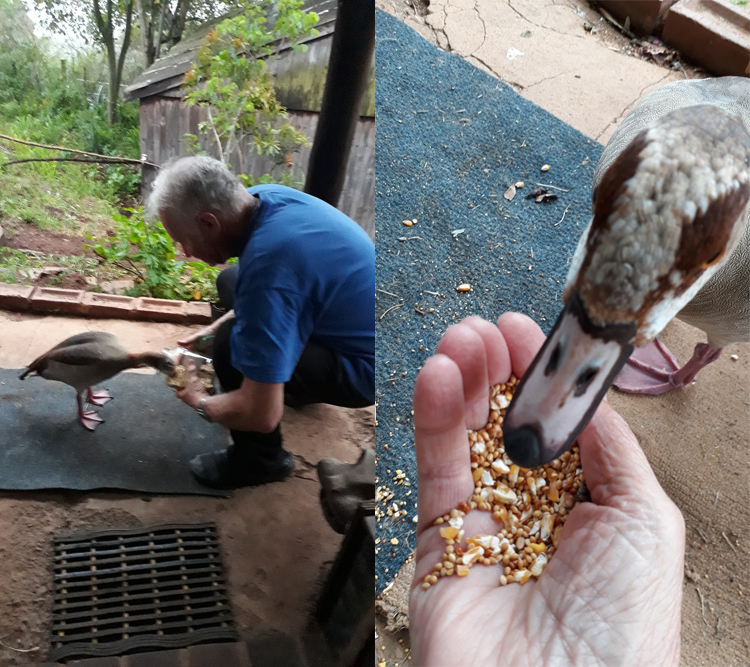 He made himself at home, swimming in the pool and feeding in the grass. John bought a bag of wild bird seeds and, because of John’s unbelievably gentle aura, Georgie, as he named him, soon got into the habit of feeding out of his hand.