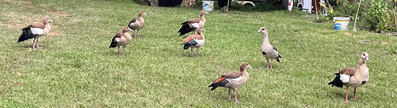 Then, out of the blue, on the 15th November 2025, a small flock of geese flew in. Father, Mother and 6 ‘teenage’ goslings. They lingered on the grass. We quickly tried to find the food and failed. Cameras came out and we called “Georgie”. He seemed to respond, but we didn’t get too close. The family walked up to the pool, but didn’t dive in. Then, as if by some hidden command they flew away in V formation.