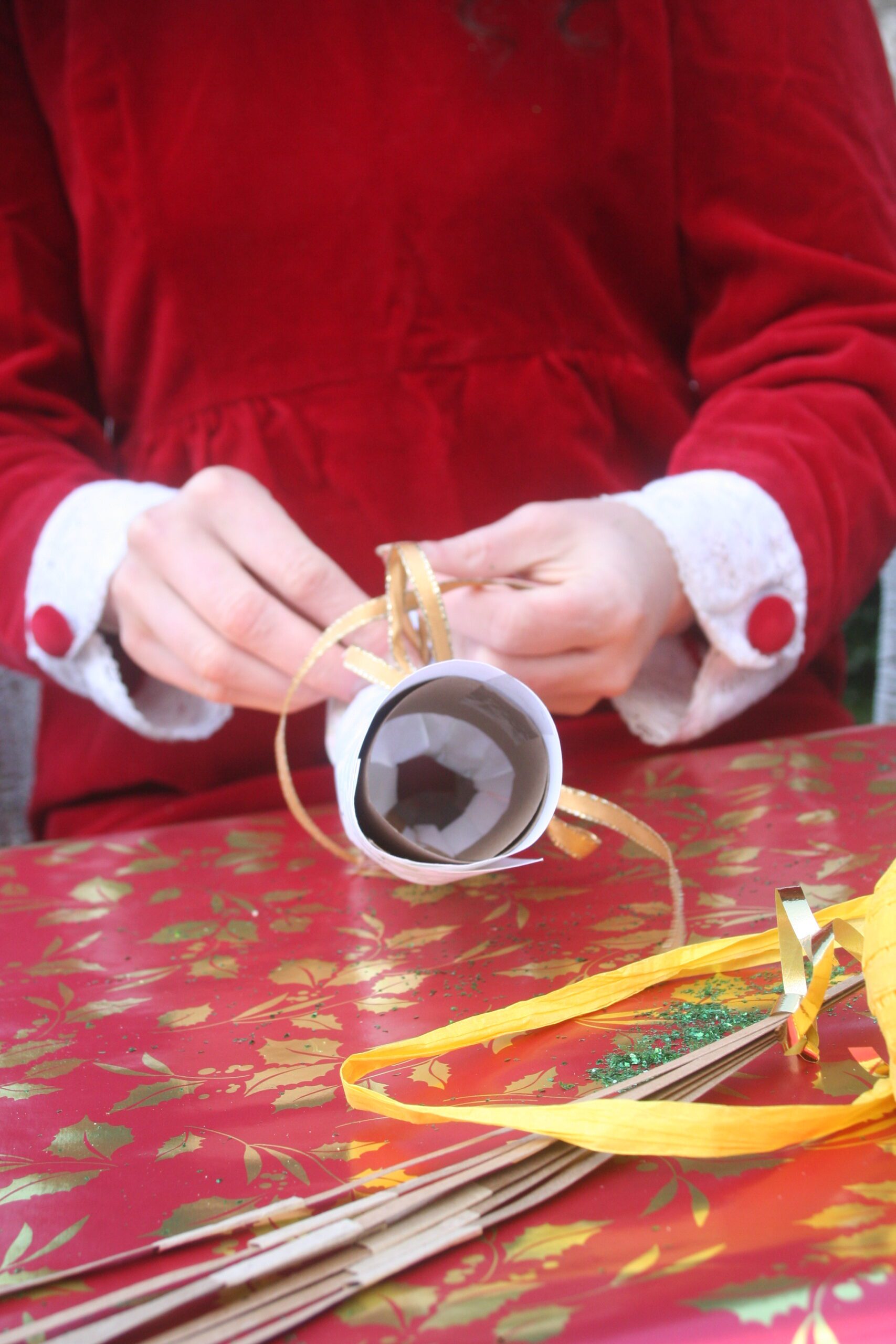 4. Using a piece of thin ribbon, tie around the paper at the ends of the central section in the paper to create a neck at either end of the cracker - Add gifts, handwritten messages or jokes to the cracker by dropping them carefully into one end. Personalise your crackers by adding decorations such as bows and ribbons and name tags.