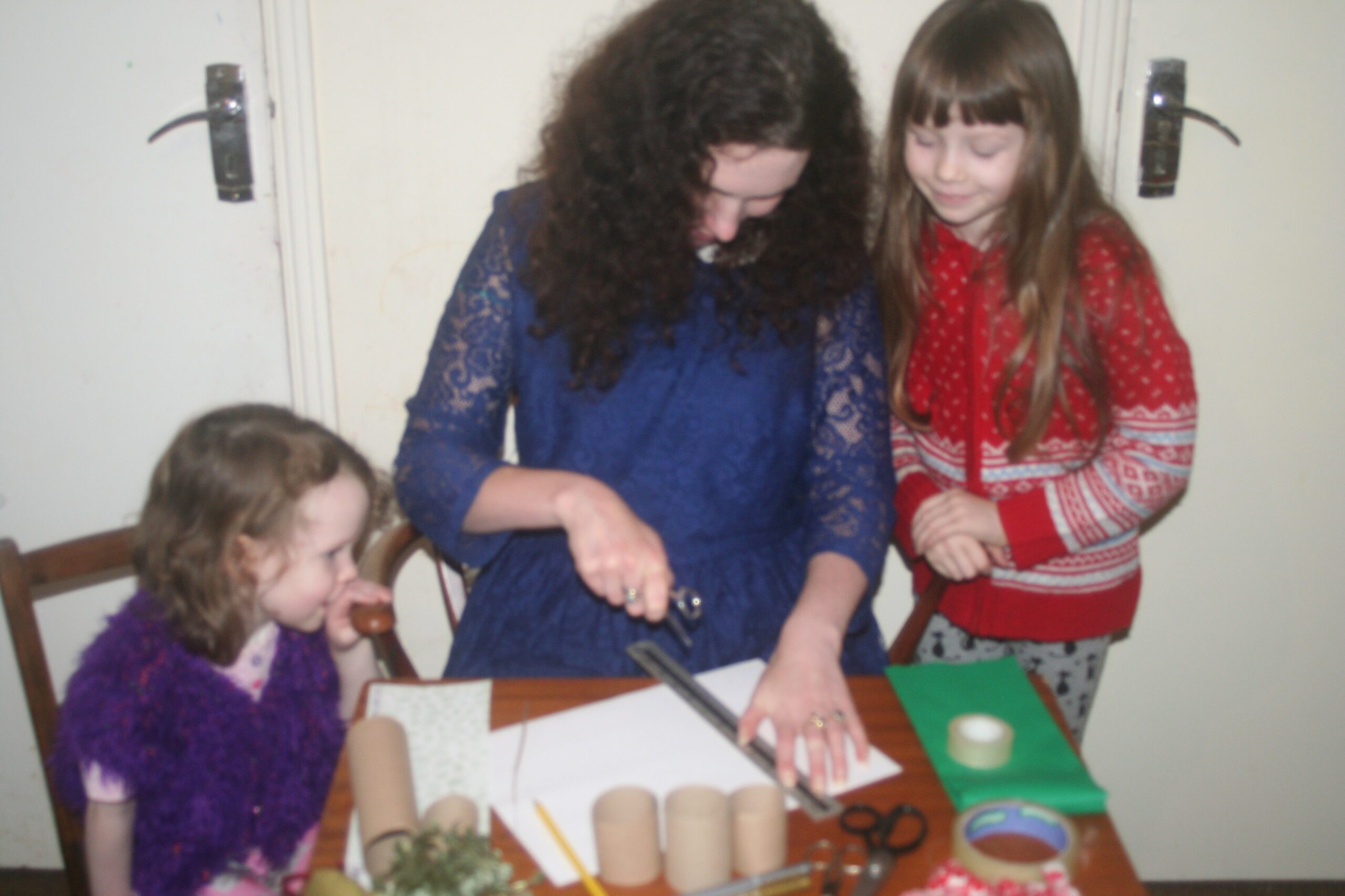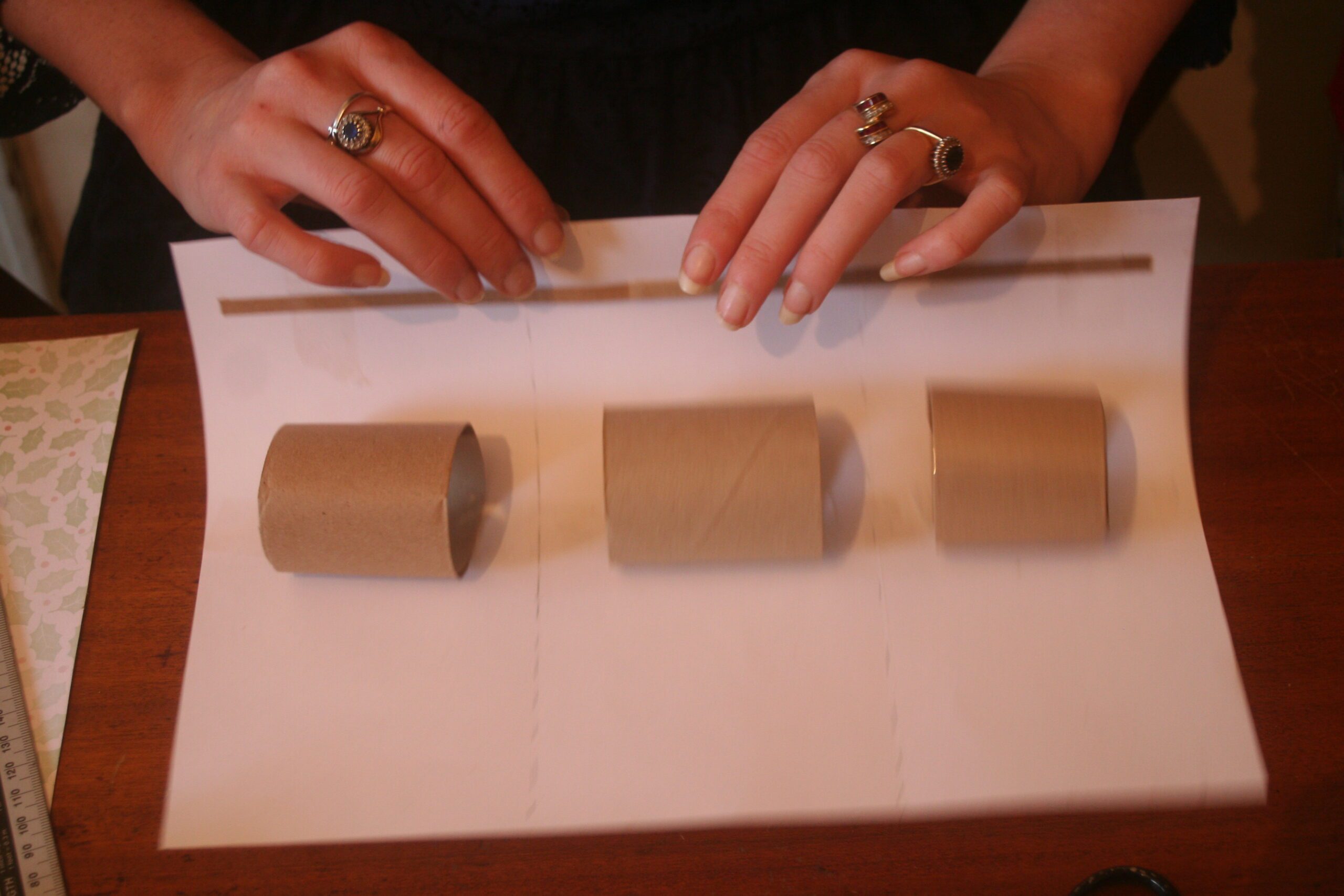 - Divide the A4-size paper into three by scoring it lightly. Cut up the kitchen-roll barrel into three parts, ensuring that one piece is slightly larger than the others. This will form the central part of the cracker