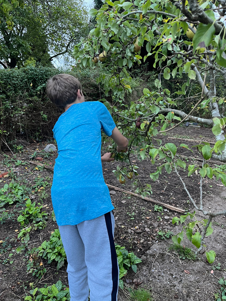 Apple trees – Granny Smiths, Russets, Coxs and red ‘eaters’. Plum trees – damsons and Golden Victorias. Pear trees – Conference and Williams. As well as all the brambles and currant varieties.