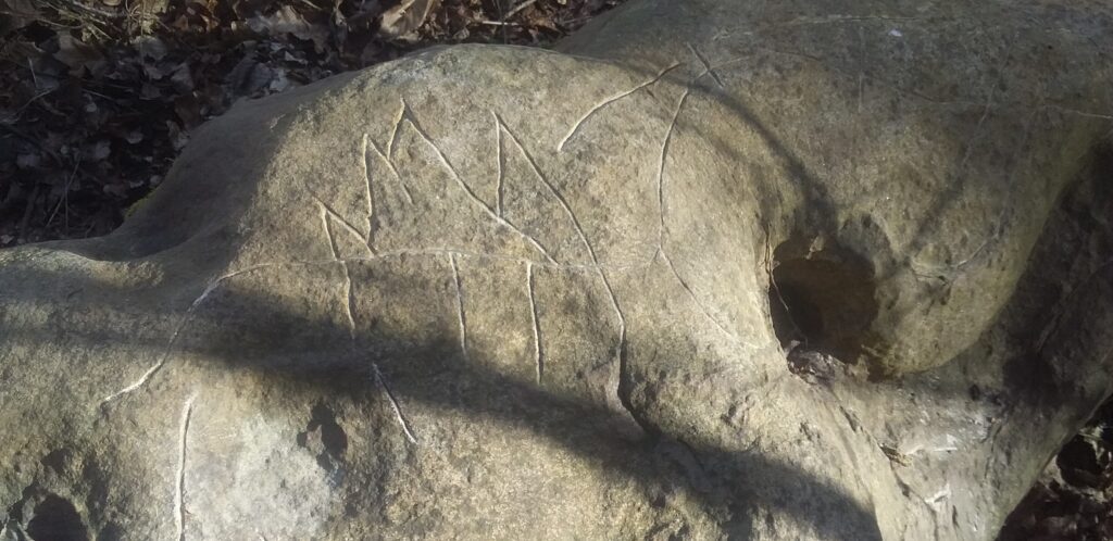 It comes from the name Huck, the ing part of the name just meaning “of the tribe of the Ingovanes.” This personal name could have been male or female, so using this uncertainty and the woodland setting I thought I’d draw a rough abstract image depicting the northern creation myth of man and woman from an ash and elm trees. Armed with my rough sketches I set to work on the rock.