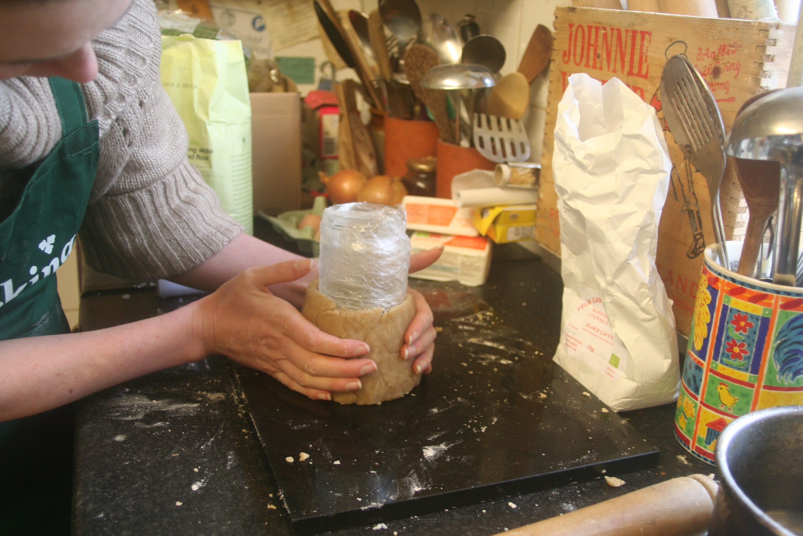 Whilst warm reserve a third of the pastry for the lid of the pie and for the remaining pastry around a jam jar to make a pie case.