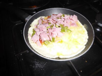Spread the ingredients of your choice over half the omelette. Leave it to cook for a few minutes.