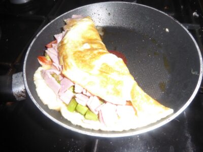 Fold half the omelette over the ingredients. Leave it for about a minute to get hot.
