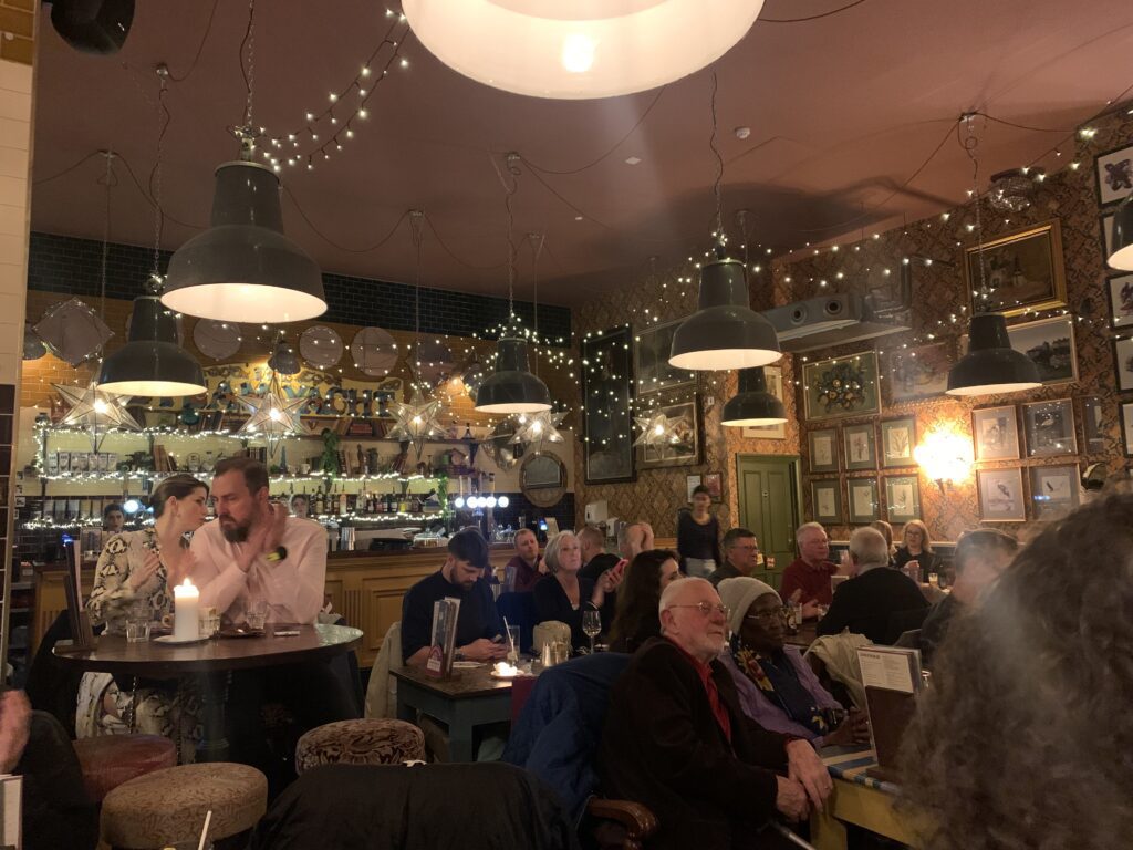 Part of the wider Lounges chain, a UK-based group known for its eclectic, community-focused venues, Carlo Lounge follows the brand’s familiar formula: relaxed, slightly quirky, and designed to feel like a ‘home-from-home,’ assuming your home houses mismatched chairs, grouped suspended lampshades and slightly disturbing artwork. My feeling of having been there before was because I pretty much had. See my previous article mentioning the Picolo Lounge in Ely – part of the same chain.