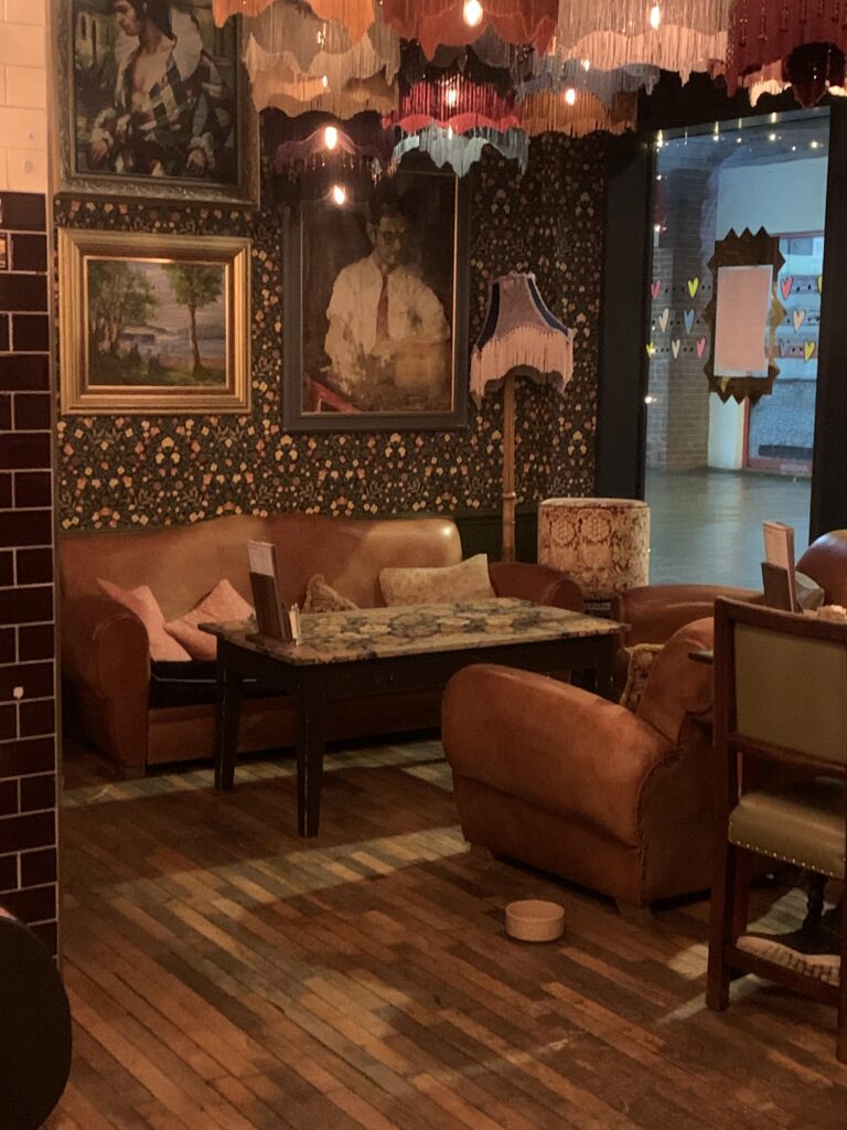 The style sounds chaotic on paper, but somehow works. The result is a deliberately eclectic, slightly theatrical space that feels cosy rather than cluttered. There are also quieter tucked away corners that beckon those who want to remain on the outskirts of the buzz and “lounge” on a comfy couch.