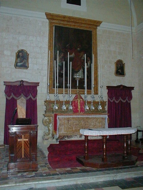 Matthew was taken prisoner and made to board a Barbary galley which headed out to sea. The woman ran to the nearby San Dimitri Chapel and fervently threw herself in front of a painting of the saint and supplicated him to save her son in exchange for which she would light an oil lamp of devotion to the saint every day.