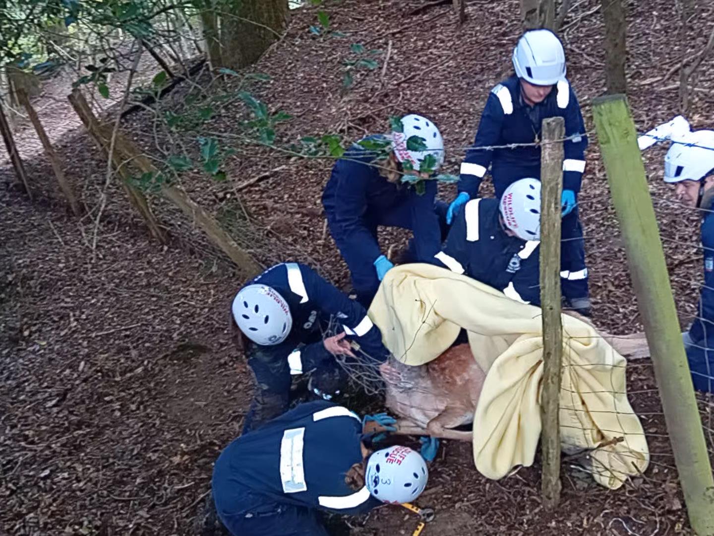 Local residents first spotted the deer running across private land before the distressed pair became caught on a fence. WRAS’s specialist deer team, travelling in two veterinary ambulances including a technical rescue vehicle, which quickly attended the scene.