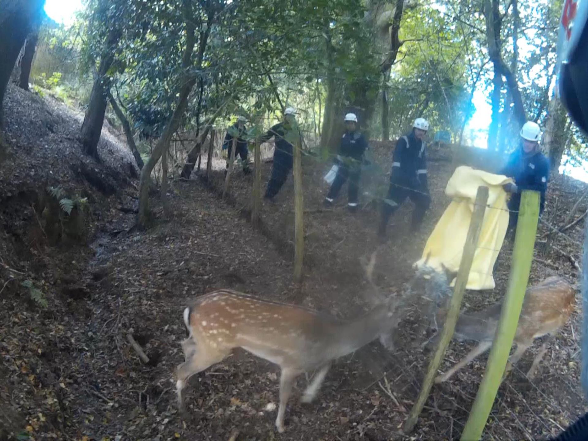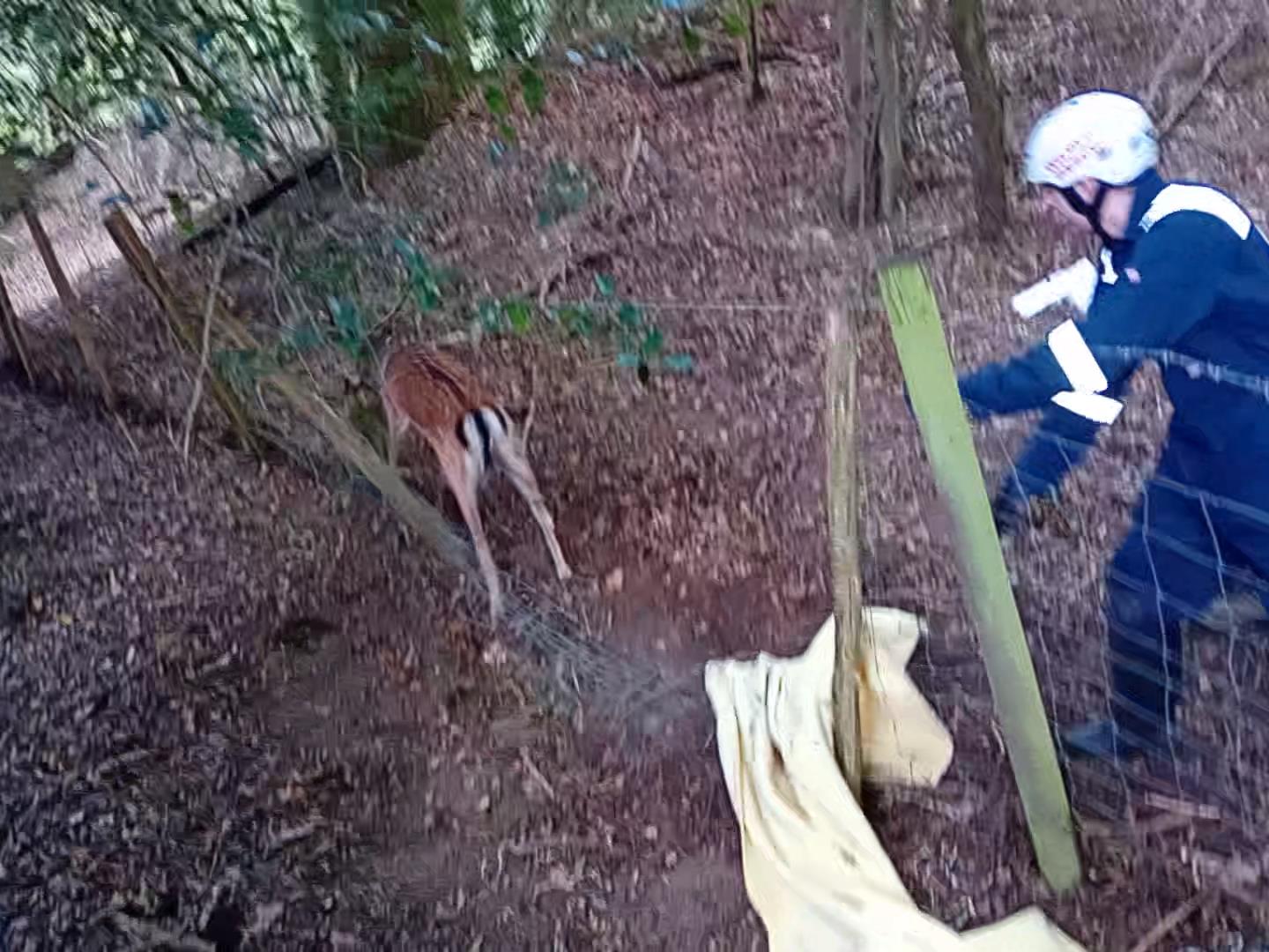 Rescuers worked swiftly to prevent Capture Myopathy – a fatal stress condition that can affect deer and other wildlife. Within just 13 minutes, both bucks were safely disentangled and released back into the wild. The second buck required more time due to being caught in the fence, but both ran off strongly and are expected to survive.